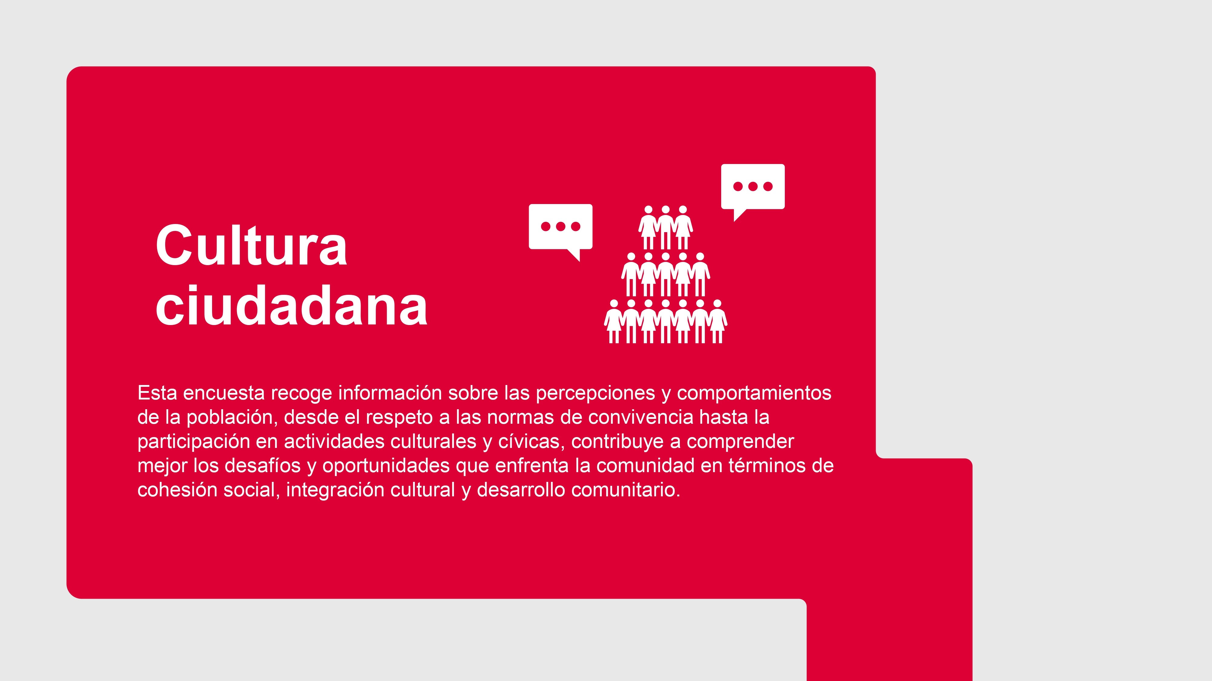 This survey gathers information on the perceptions and behaviours of the population, from respect for the rules of coexistence to participation in cultural and civic activities, and contributes to a better understanding of the challenges and opportunities faced by the community in terms of social cohesion, cultural integration and community development.